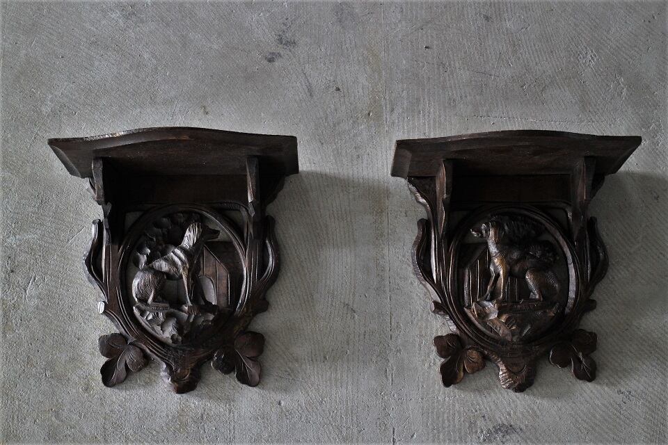 フランス 犬が彫刻された木製ウォールデコレーション ペア 5297_YA