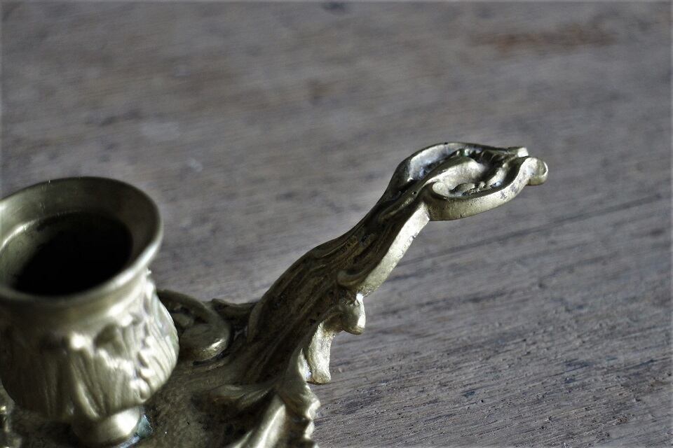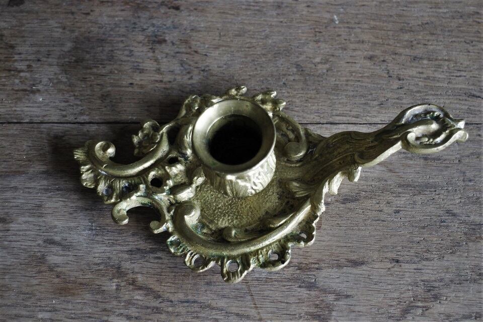 ハンドルが付いたバロックな雰囲気のブロンズキャンドルスタンドです。ずっしりと重く、植物モチーフのデザインが加工されています。サインはありませんが迫力が感じられる作品です。年月を経て変色した色合いや少し歪に変形しているところなど、とても良い雰囲気です。