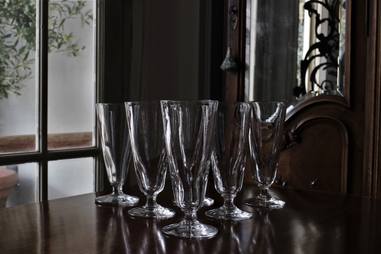 こちらは吹きガラスで作られたフランス19世紀のグラスです。波打つガラスが飴細工のようで、歪さに温もりが感じられます。たっぷり入りますのでグラスとしても使えますが、高さがありますので花を飾っても絵になります。アンティーク特有の細かい傷はございますが、ヒビや欠けはございません。価格は一つのお値段です。
