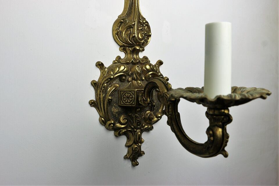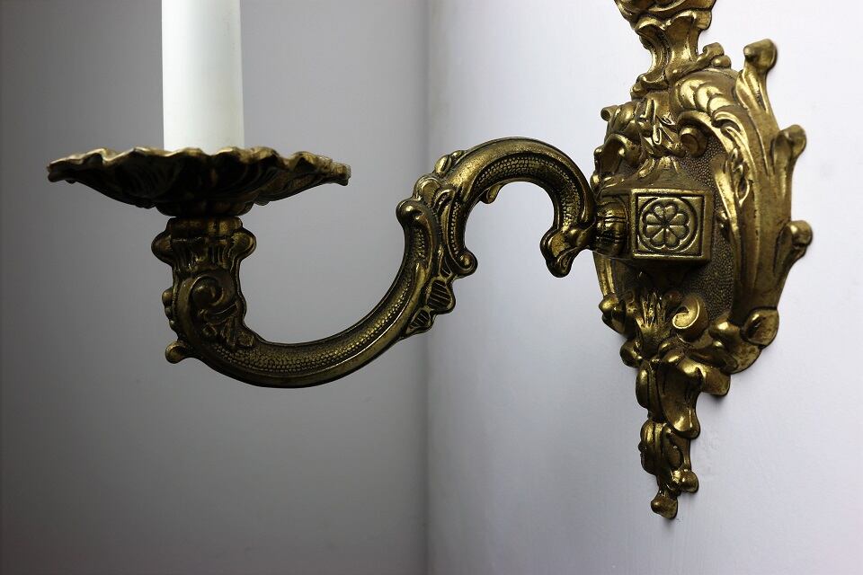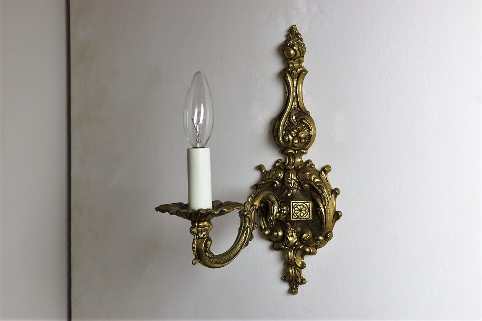 フランスの1灯式真鍮ウォールランプです。アカンサスの葉が生き生きと表現されています。クラシカルな照明器具は素敵な空間を演出してくれます。配線コードを延長してコンセントを取付けることも可能です。アンティーク特有の細かい傷はございますが、ヒビや欠けはございません。