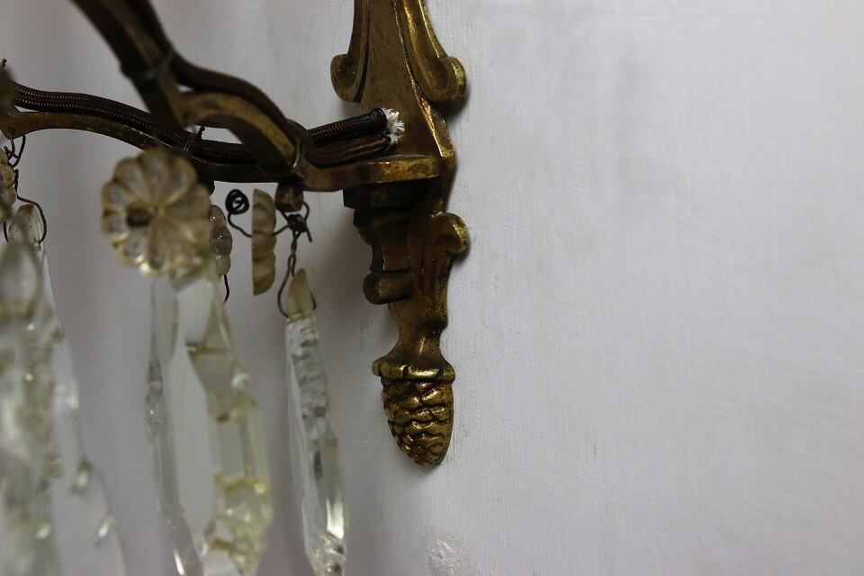 ドレスのようなドロップが付いたフランスの2灯式ウォールランプです。アーティチョークが施されたゴールド色のベースにドロップがゆらゆら揺れて、優雅な佇まいです。小ぶりなので玄関や柱、壁のアクセントにいかがでしょうか?ご希望があれば、配線コードを延長したりコンセントを取付けできますので、お問合せ下さい。
