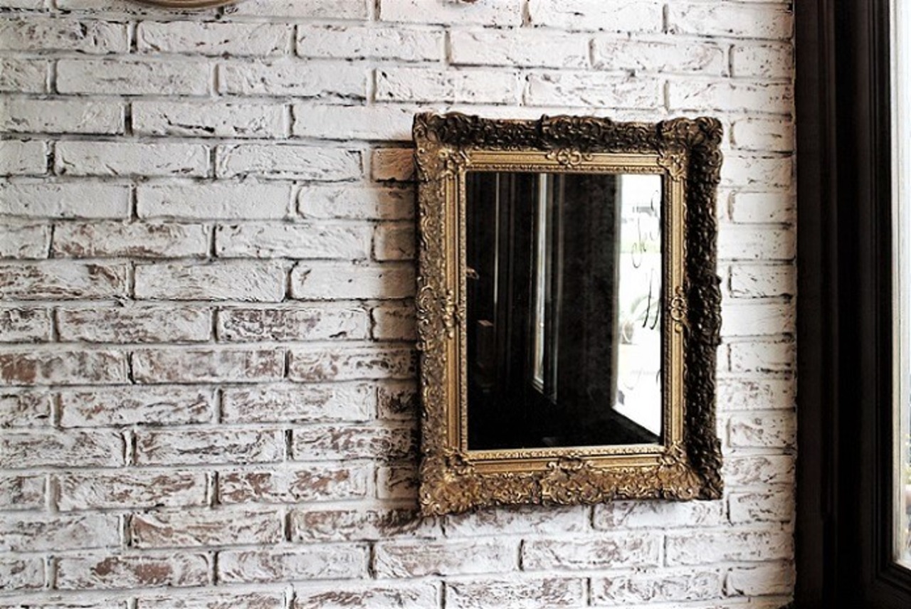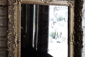 デコラティブなフレームが美しい落ち着いた色合いのゴールドペイントミラーです。絵のように飾っても素敵です。照明が写り込むととても綺麗です。ミラーに曇りがございます。