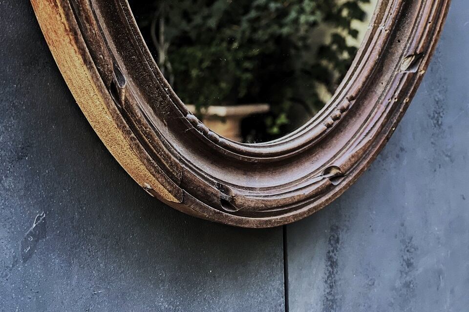 古い木製フレームのフランスのミラーです。エレガントなリボンの装飾が施され、時を経た木の風合いが魅力的です。アンティーク特有の細かい傷がございます。ミラーは新しいものに交換済みです。