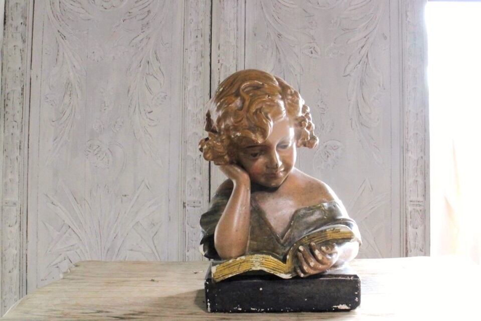 本を読む少女の胸像です。ウェーブのかかった金髪、肩から滑り落ちた服も気にすること無く手の上に頭をのせてじっと本を読んでいる姿は絵画のモデルのようで、置いてあるだけで気配を感じるようなほど存在感があります。同じように本を読む少女のデザインの胸像が多く作られていますが、こちらはとてもエレガントで優しく端整な顔立ちです。時を経た塗装の色合いやペンキの剝れがとてもシャビーシックな雰囲気です。