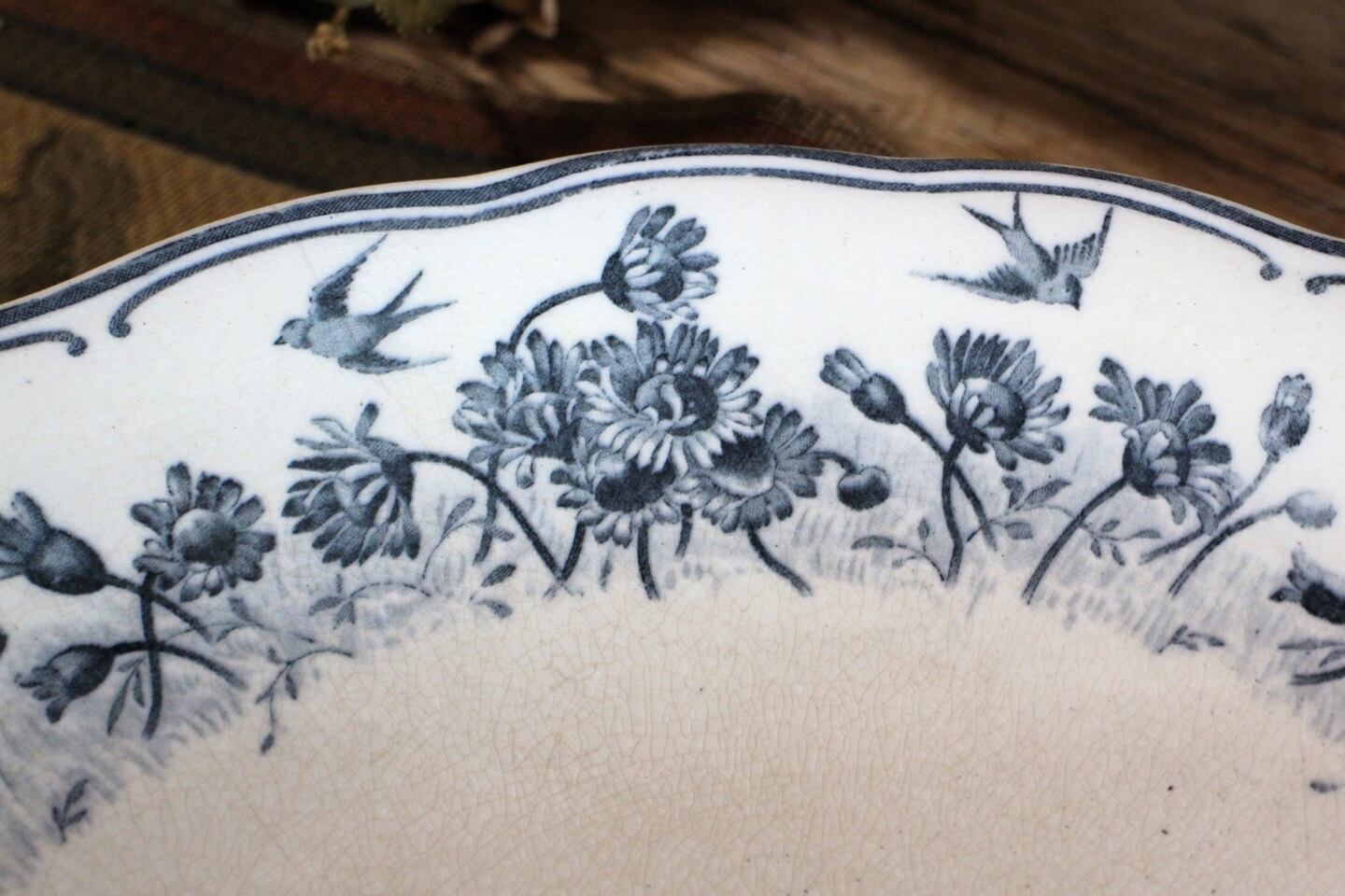 フランス、1784年創業のSarreguemines(サルグミンヌ)の『Paquerettes』というシリーズのプレートです。優しい白の陶器に青い色のデイジー(ヒナギク)とツバメの柄が描かれています。裏に1890~1918年代に使われていたスタンプがございます。アンティークの陶器特有の細かい傷や貫入、シミがございます。