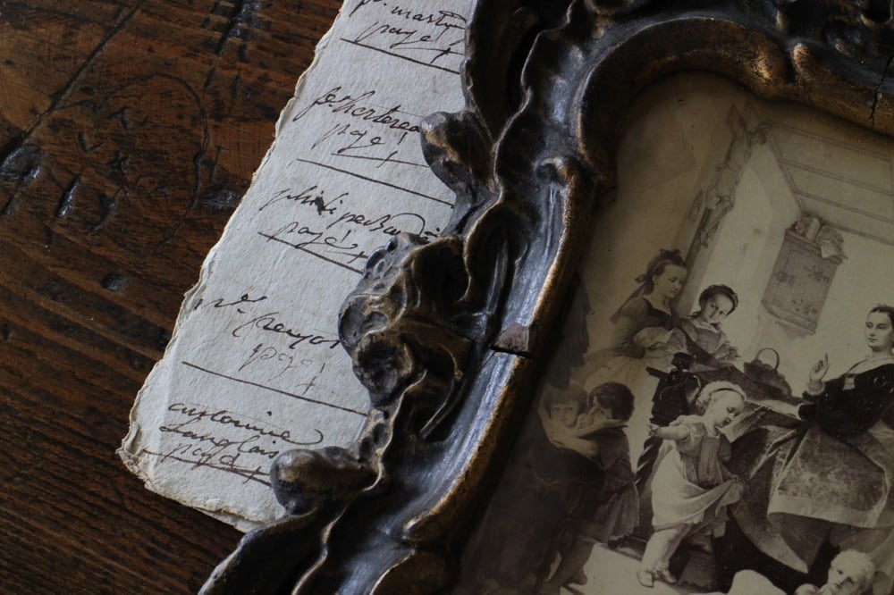 フランスでみつけた1871年の古い手紙が入ったロココな木製フレームです。ゴールドと黒が塗られた迫力ある彫刻に、時を経たフレームの塗装の剝れや色合いが、とても良い雰囲気です。裏側にもガラスが嵌め込まれています。フックが付いていますので、壁に掛けられます。アンティーク特有の細かい傷がございますが比較的綺麗な状態です。