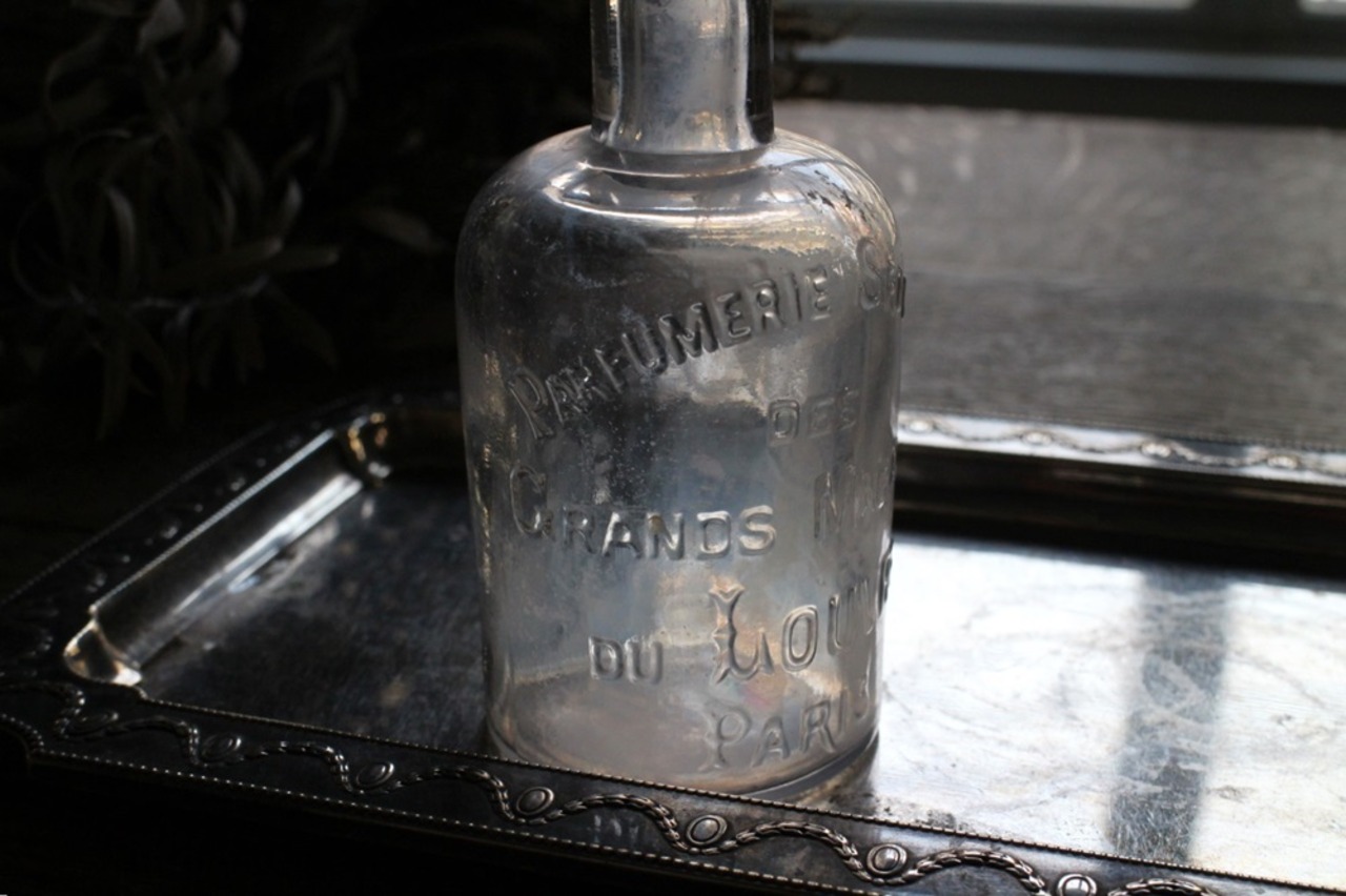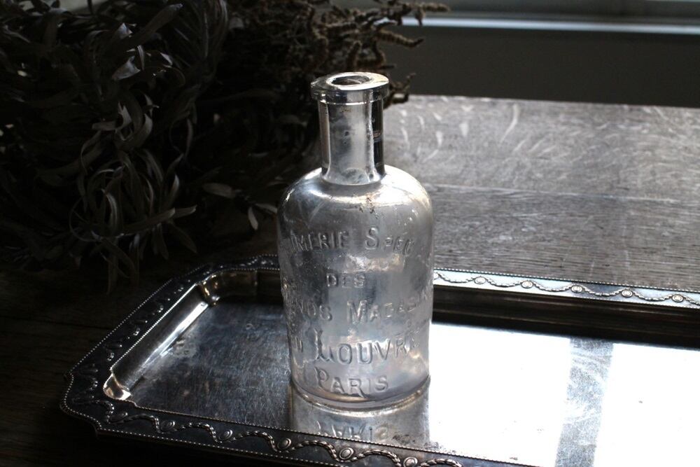 フランスの1920年頃の歯磨き剤のガラスボトルです。この頃から歯ブラシが使われるようになったようです。ボトルには『VeritaEau Dentifrice de Botot entrepot a Paris 10 Rue de la Paix』の文字が書かれているところが魅力的です。そのまま置いてあるだけでも可愛らしいですが、グリーンを飾っても素敵ですね。アンティーク特有の細かい傷はございますが、ヒビや欠けはございません。