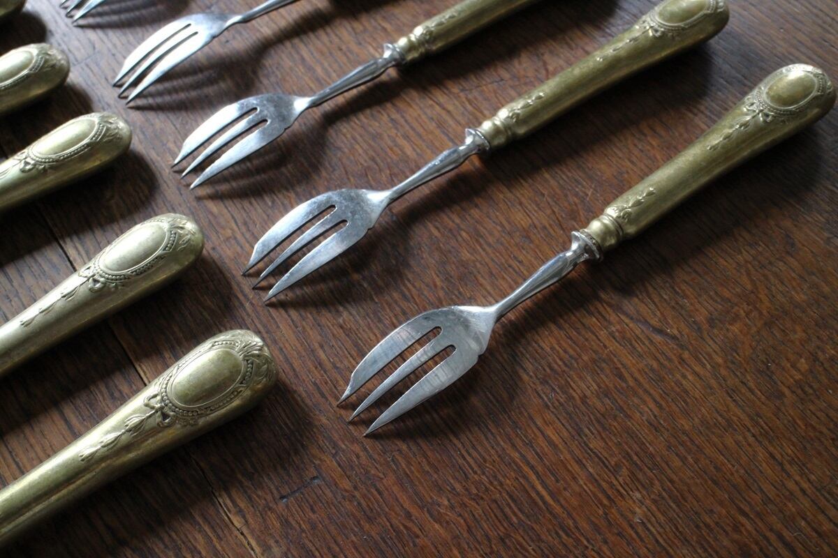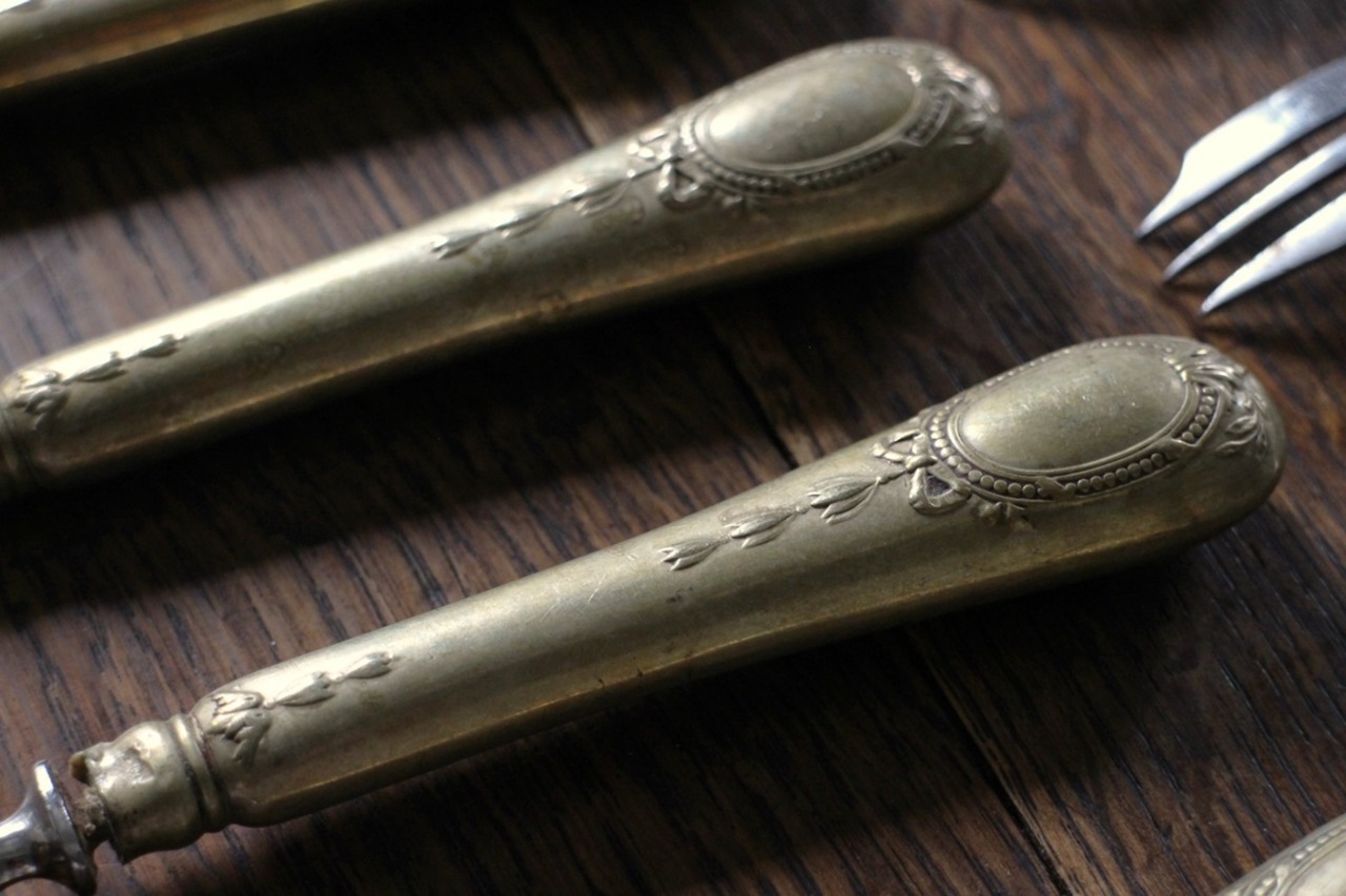 フランスでみつけた持ち手が真鍮製のガーランド柄のデザートフォークです。リボンモチーフの高級感のあるエレガントなデザインです。アンティーク特有の細かい傷はございますが、ヒビや欠けはございません。