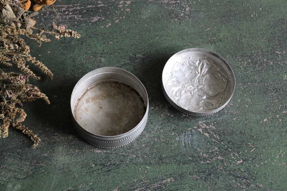 シクラメンのエンボスが施されたフランスのパウダーケースです。メーカーなどは不明ですが、アールヌーボーのデザインがエレガントな雰囲気です。なかなか見かけないアルミで出来た古いものです。アンティーク特有の細かい傷がございますが、新しいものには無い年月を経て刻まれた奥深い味わいとして感じて頂きたいです。