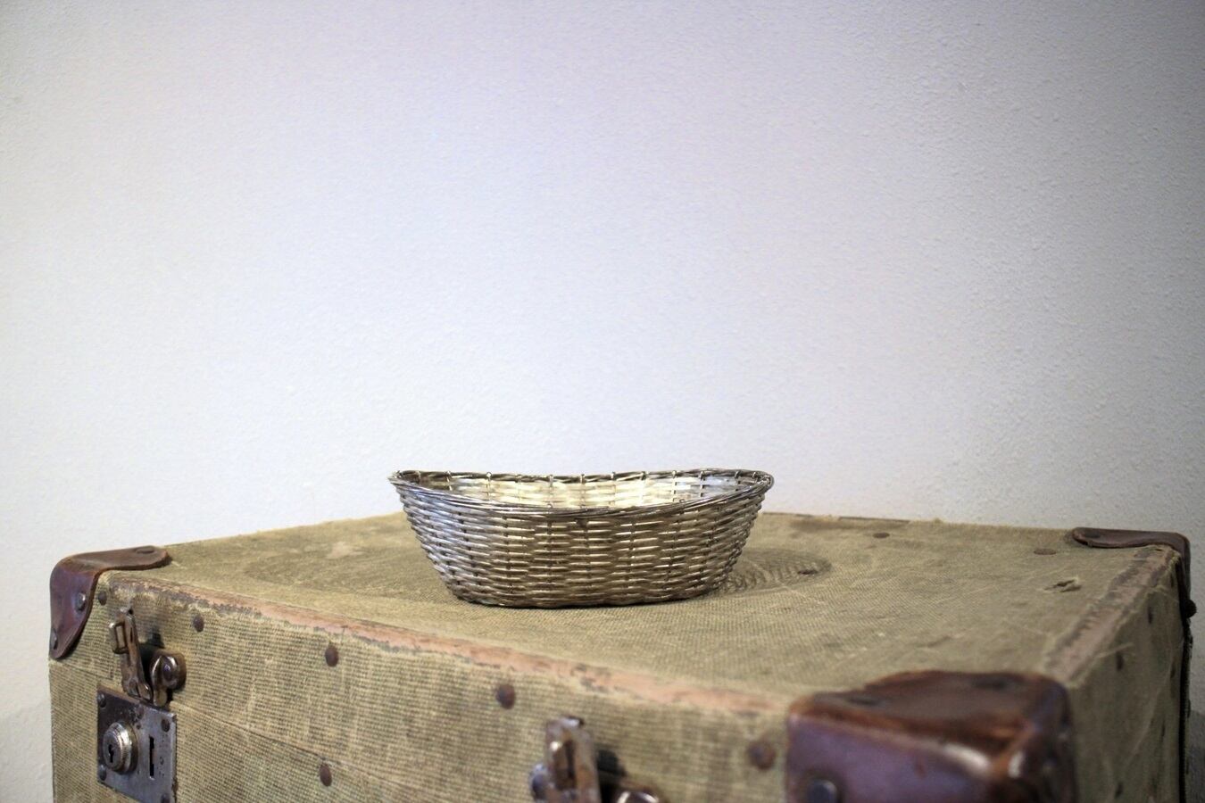 フランスでみつけたメタルのバスケットです。底面から外側に向かって曲げたりねじりを入れたりして丁寧に編まれています。年月を経て付いたアンティーク特有の細かい傷や変色しているところに味わいが感じられます。上部の縁には丸いワイヤーが施され籐編み籠の雰囲気が表現されています。鉄にシルバープレート加工され、しっかりと編まれたバスケットです。