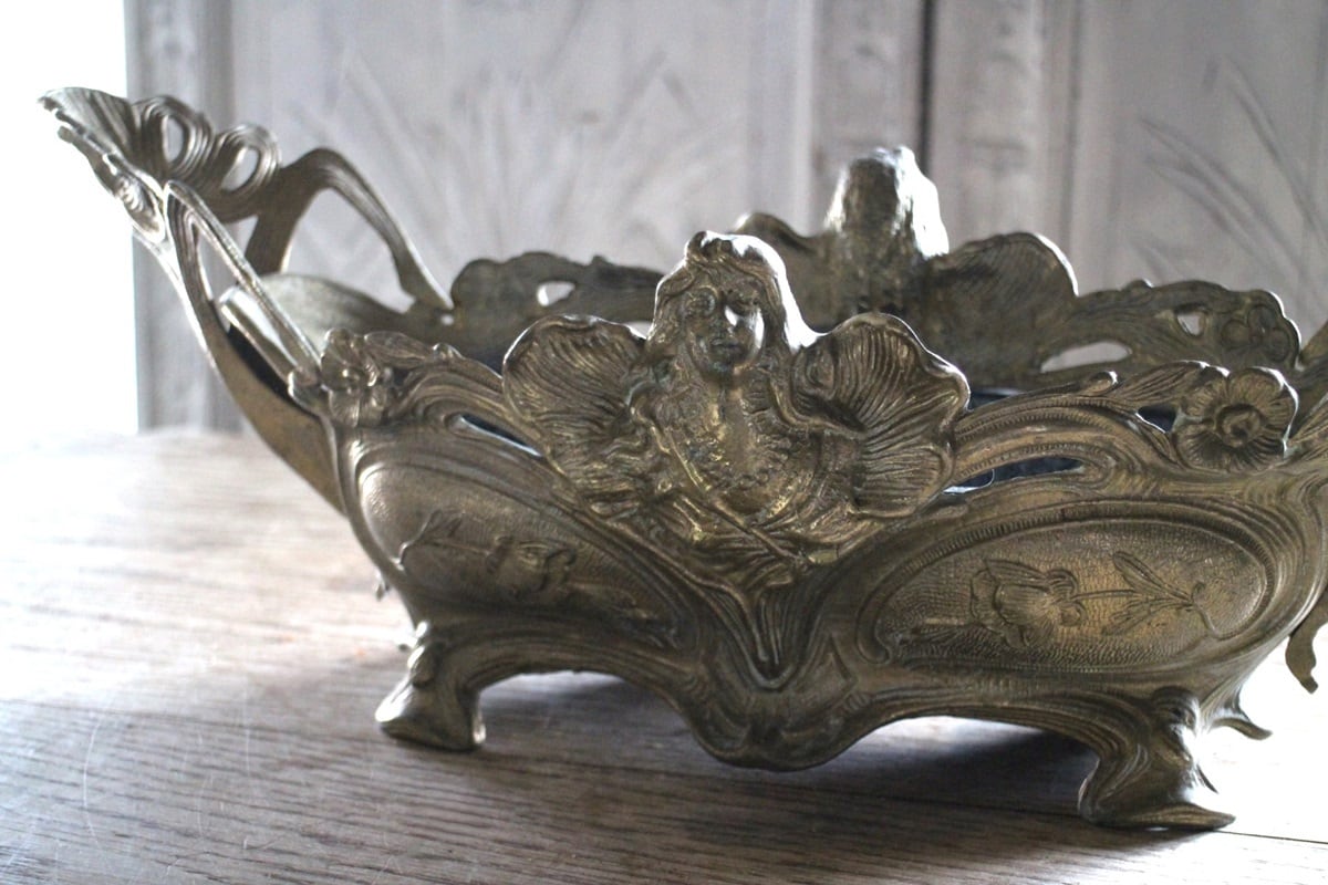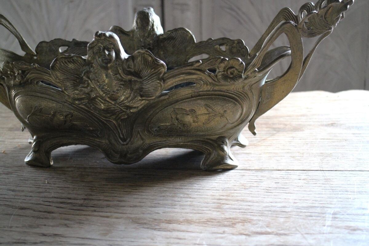 アールヌーボーデザインの真鍮のジャルディニエールです。中側には錆びてサイドに穴が開いて後から黒く塗られたトレーが嵌め込まれています。真ん中にはフェアリー、その周りには草花が美しいアールヌーボーの曲線によって表現されています。使い込まれた真鍮の雰囲気にグリーンやお花を飾るととても素敵な空間が作れます。内側に低めの器を入れて使用すると花器としてもお使い頂けます。重さもあり、しっかりとした安定した作りです。