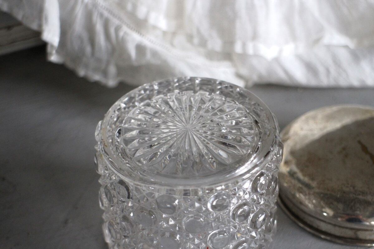 金属製の蓋が付いたクリスタルガラスの英国製ラウンドケースです。ダイヤカットデザインでキラキラと輝きます。コットンやアクセサリー入れとしていかがでしょうか。金属の材質は真鍮にシルバープレートだと思われます。蓋に凹みがございます。アンティーク特有の細かい傷、内側に小さなチップがございます。