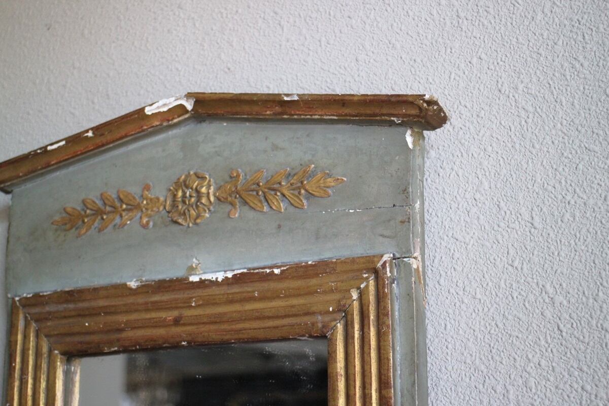 こちらはナポレオン三世様式のペイントされたフランスのミラーです。長い年月を経たブルーグレーとゴールドの色合いや所々剝れた石膏の雰囲気がアンティークならではの雰囲気でとても魅力的です。クラシカルなミラーは特別な空間を演出してくれます。ミラーは古いオリジナルのもので、アンティーク特有の細かい傷がございます。