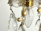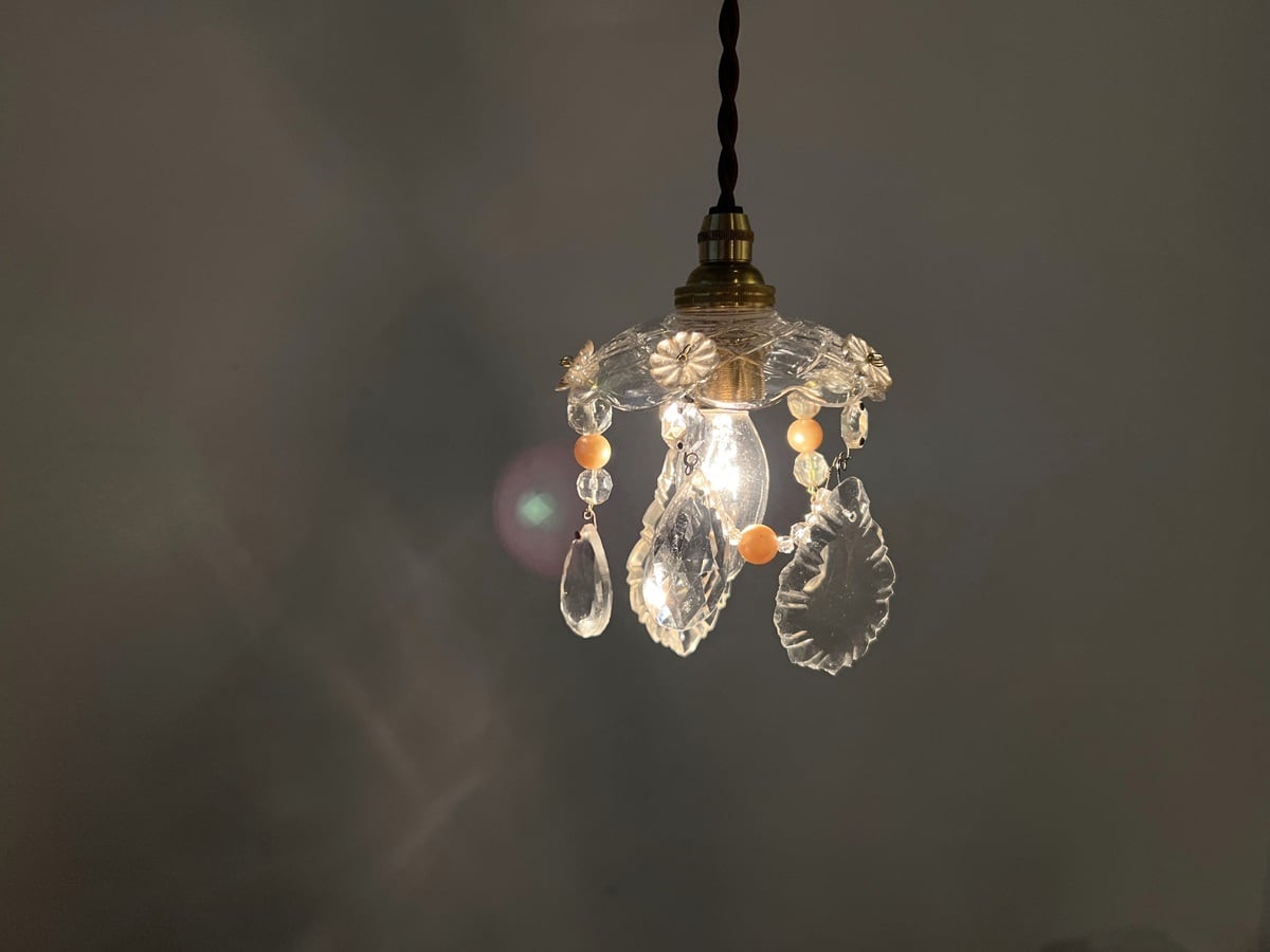 アンティークのクリスタルドロップとアンティークビーズを使ってミニシャンデリアに仕立てました。灯りを付けなくてもクリスタルドロップがきらきらと光り、玄関や窓辺などちょっとしたスペースに付けるだけでお気に入りの空間に変わります。アンティーク特有の細かい傷がございますが、古いものならではの味わいとして楽しんでいただきたいです。コード部分は新しいものです。引掛けシーリングでご自宅の天井にそのまま取り付けできます。